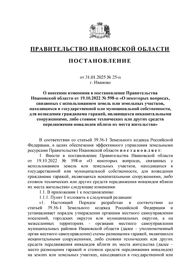 Постановление Правительства Ивановской области от 31.01.2025 N 25-п "О внесении изменения в постановление Правительства Ивановской области от 19.10.2022 N 598-п "О некоторых вопросах, связанных с использованием земель или земельных участков, находящихся в государственной или муниципальной собственности, для возведения гражданами гаражей, являющихся некапитальными сооружениями, либо стоянок технических или других средств передвижения инвалидов вблизи их места жительства" (вместе с "Порядком определения платы за использование земель или земельных участков, находящихся в собственности Ивановской области, земель или земельных участков, государственная собственность на которые не разграничена, для возведения гражданами гаражей, являющихся некапитальными сооружениями")