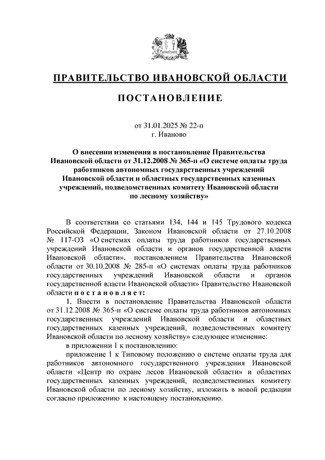 Постановление Правительства Ивановской области от 31.01.2025 N 22-п "О внесении изменения в постановление Правительства Ивановской области от 31.12.2008 N 365-п "О системе оплаты труда работников автономных государственных учреждений Ивановской области и областных государственных казенных учреждений, подведомственных комитету Ивановской области по лесному хозяйству"