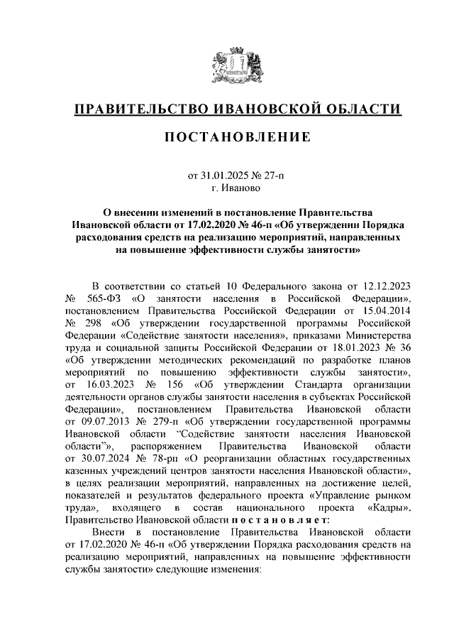 Постановление Правительства Ивановской области от 31.01.2025 N 27-п "О внесении изменений в постановление Правительства Ивановской области от 17.02.2020 N 46-п "Об утверждении Порядка расходования средств на реализацию мероприятий, направленных на повышение эффективности службы занятости"
