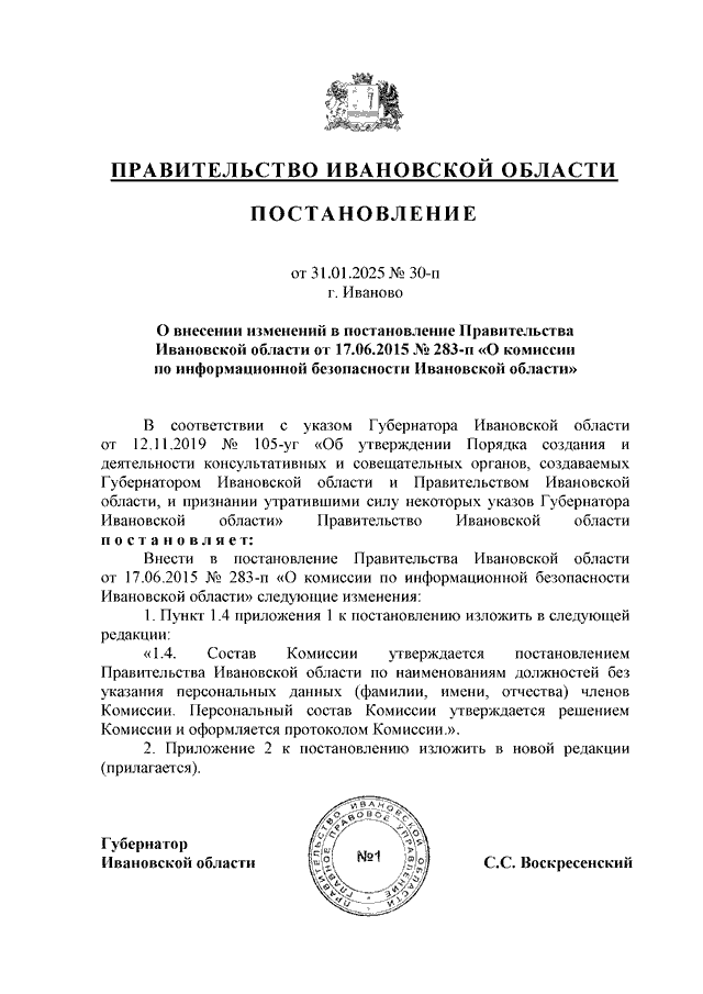 Постановление Правительства Ивановской области от 31.01.2025 N 30-п "О внесении изменений в постановление Правительства Ивановской области от 17.06.2015 N 283-п "О комиссии по информационной безопасности Ивановской области"