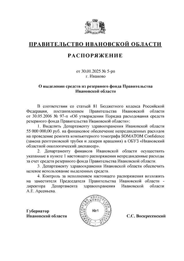 Распоряжение Правительства Ивановской области от 30.01.2025 N 5-рп "О выделении средств из резервного фонда Правительства Ивановской области"