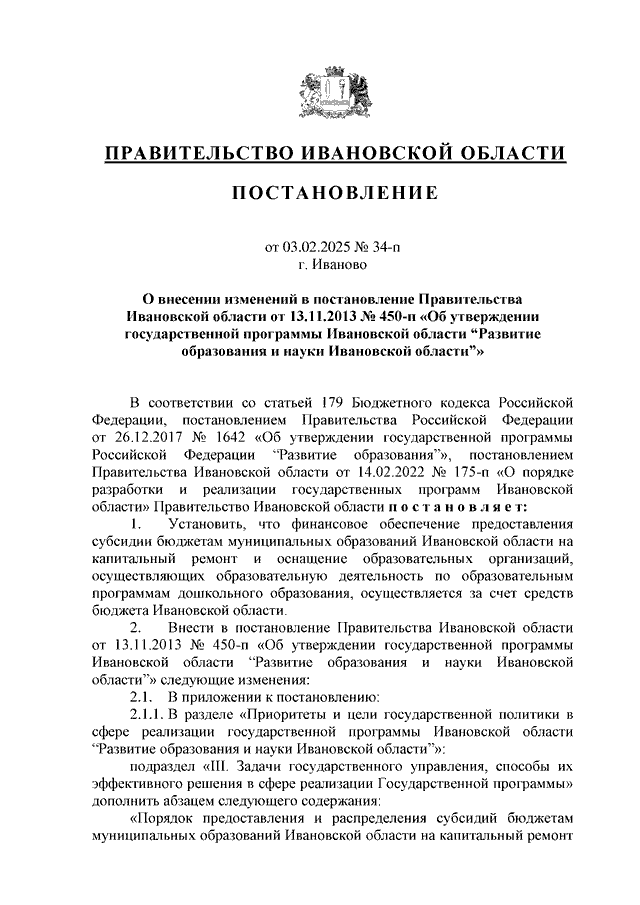 Постановление Правительства Ивановской области от 03.02.2025 N 34-п "О внесении изменений в постановление Правительства Ивановской области от 13.11.2013 N 450-п "Об утверждении государственной программы Ивановской области "Развитие образования и науки Ивановской области" (вместе с "Порядком предоставления и распределения субсидий бюджетам муниципальных образований Ивановской области на капитальный ремонт и оснащение образовательных организаций, осуществляющих образовательную деятельность по образовательным программам дошкольного образования")