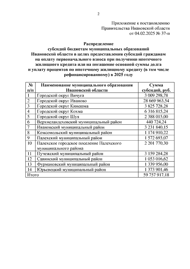 Постановление Правительства Ивановской области от 04.02.2025 N 37-п "О распределении субсидий бюджетам муниципальных образований Ивановской области в целях предоставления субсидий гражданам на оплату первоначального взноса при получении ипотечного жилищного кредита или на погашение основной суммы долга и уплату процентов по ипотечному жилищному кредиту (в том числе рефинансированному) в 2025 году"