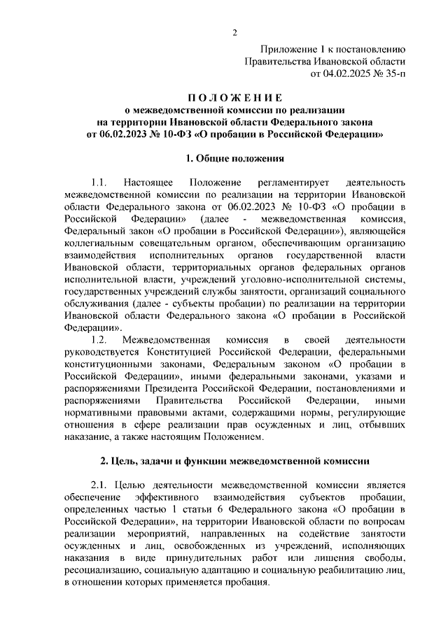 Постановление Правительства Ивановской области от 04.02.2025 N 35-п "О межведомственной комиссии по реализации на территории Ивановской области Федерального закона от 06.02.2023 N 10-ФЗ "О пробации в Российской Федерации" (вместе с "Положением о межведомственной комиссии по реализации на территории Ивановской области Федерального закона от 06.02.2023 N 10-ФЗ "О пробации в Российской Федерации")