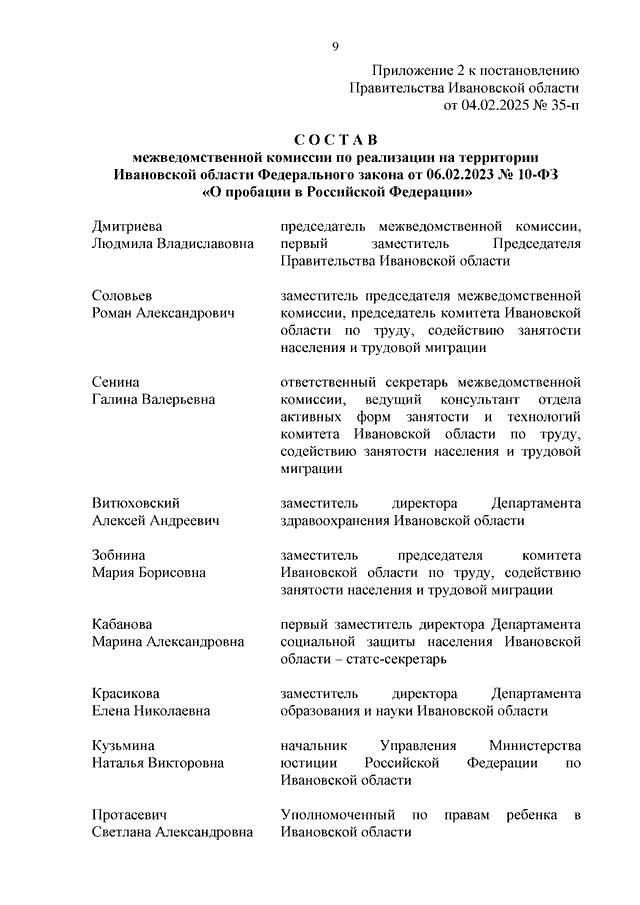 Постановление Правительства Ивановской области от 04.02.2025 N 35-п "О межведомственной комиссии по реализации на территории Ивановской области Федерального закона от 06.02.2023 N 10-ФЗ "О пробации в Российской Федерации" (вместе с "Положением о межведомственной комиссии по реализации на территории Ивановской области Федерального закона от 06.02.2023 N 10-ФЗ "О пробации в Российской Федерации")