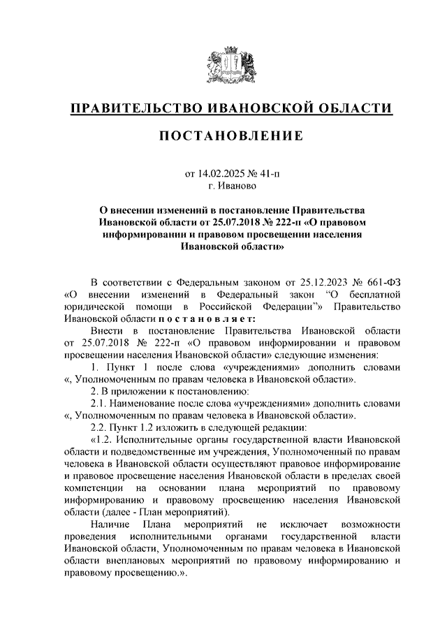 Постановление Правительства Ивановской области от 14.02.2025 N 41-п "О внесении изменений в постановление Правительства Ивановской области от 25.07.2018 N 222-п "О правовом информировании и правовом просвещении населения Ивановской области"