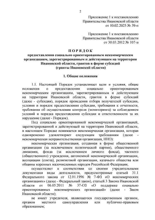 Постановление Правительства Ивановской области от 10.02.2025 N 39-п "О внесении изменений в постановление Правительства Ивановской области от 30.03.2012 N 107-п "О порядке, объемах и условиях предоставления поддержки социально ориентированным некоммерческим организациям, зарегистрированным и действующим на территории Ивановской области" (вместе с "Порядком предоставления социально ориентированным некоммерческим организациям, зарегистрированным и действующим на территории Ивановской области, грантов в форме субсидий (гранты Ивановской области)", "Порядком предоставления социально ориентированным некоммерческим организациям, зарегистрированным и действующим на территории Ивановской области, являющимся исполнителями общественно полезных услуг, грантов в форме субсидий на оказание общественно полезной услуги")