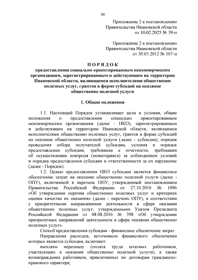 Постановление Правительства Ивановской области от 10.02.2025 N 39-п "О внесении изменений в постановление Правительства Ивановской области от 30.03.2012 N 107-п "О порядке, объемах и условиях предоставления поддержки социально ориентированным некоммерческим организациям, зарегистрированным и действующим на территории Ивановской области" (вместе с "Порядком предоставления социально ориентированным некоммерческим организациям, зарегистрированным и действующим на территории Ивановской области, грантов в форме субсидий (гранты Ивановской области)", "Порядком предоставления социально ориентированным некоммерческим организациям, зарегистрированным и действующим на территории Ивановской области, являющимся исполнителями общественно полезных услуг, грантов в форме субсидий на оказание общественно полезной услуги")
