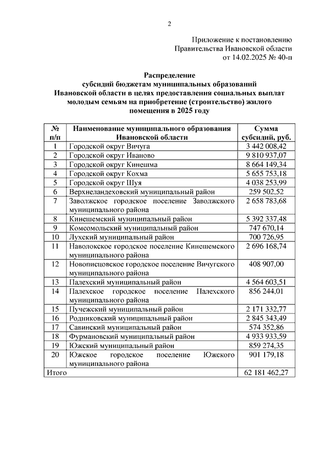 Постановление Правительства Ивановской области от 14.02.2025 N 40-п "О распределении субсидий бюджетам муниципальных образований Ивановской области в целях предоставления социальных выплат молодым семьям на приобретение (строительство) жилого помещения в 2025 году"