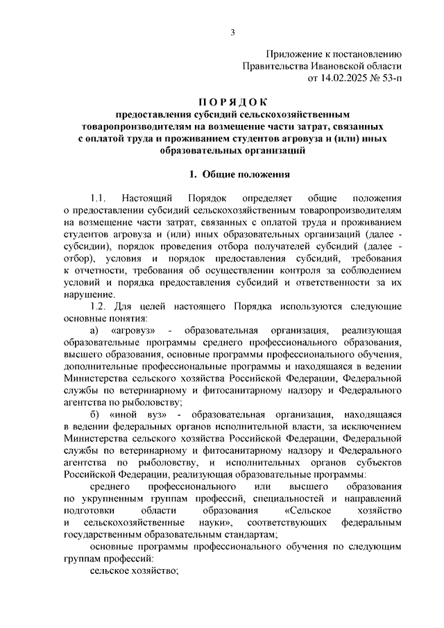 Постановление Правительства Ивановской области от 14.02.2025 N 53-п "Об утверждении Порядка предоставления субсидий сельскохозяйственным товаропроизводителям на возмещение части затрат, связанных с оплатой труда и проживанием студентов агровуза и (или) иных образовательных организаций"