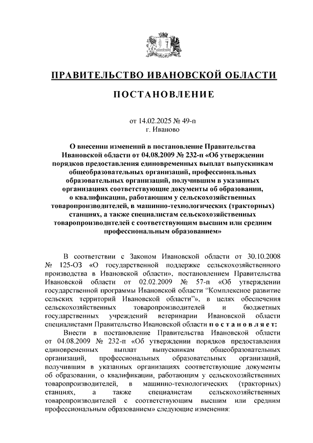 Постановление Правительства Ивановской области от 14.02.2025 N 49-п "О внесении изменений в постановление Правительства Ивановской области от 04.08.2009 N 232-п "Об утверждении порядков предоставления единовременных выплат выпускникам общеобразовательных организаций, профессиональных образовательных организаций, получившим в указанных организациях соответствующие документы об образовании, о квалификации, работающим у сельскохозяйственных товаропроизводителей, в машинно-технологических (тракторных) станциях, а также специалистам сельскохозяйственных товаропроизводителей с соответствующим высшим или средним профессиональным образованием"