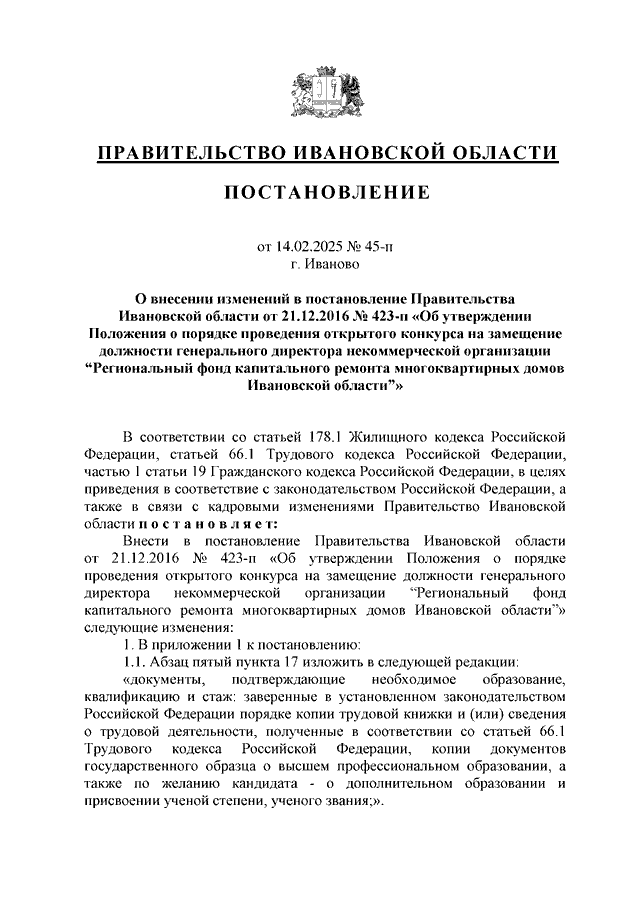 Постановление Правительства Ивановской области от 14.02.2025 N 45-п "О внесении изменений в постановление Правительства Ивановской области от 21.12.2016 N 423-п "Об утверждении Положения о порядке проведения открытого конкурса на замещение должности генерального директора некоммерческой организации "Региональный фонд капитального ремонта многоквартирных домов Ивановской области"
