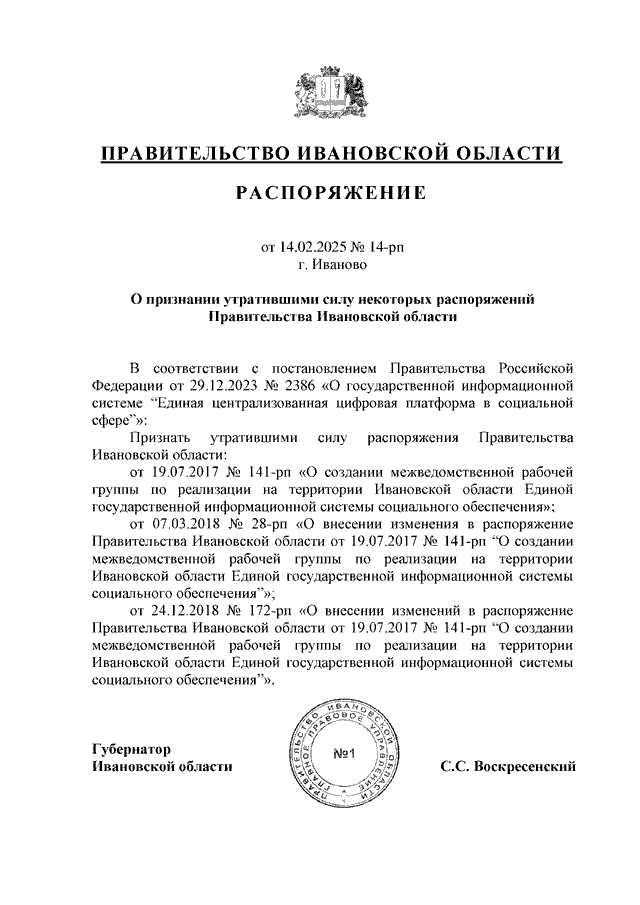 Распоряжение Правительства Ивановской области от 14.02.2025 N 14-рп "О признании утратившими силу некоторых распоряжений Правительства Ивановской области"