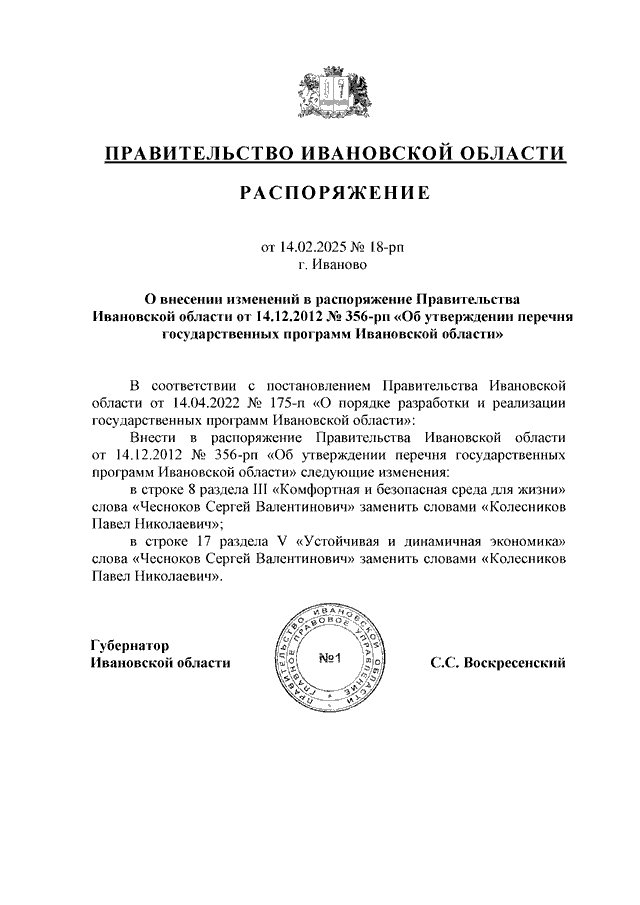 Распоряжение Правительства Ивановской области от 14.02.2025 N 18-рп "О внесении изменений в распоряжение Правительства Ивановской области от 14.12.2012 N 356-рп "Об утверждении перечня государственных программ Ивановской области"