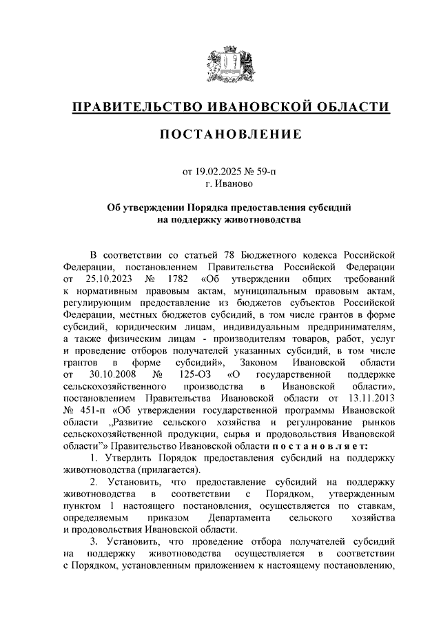 Постановление Правительства Ивановской области от 19.02.2025 N 59-п "Об утверждении Порядка предоставления субсидий на поддержку животноводства"