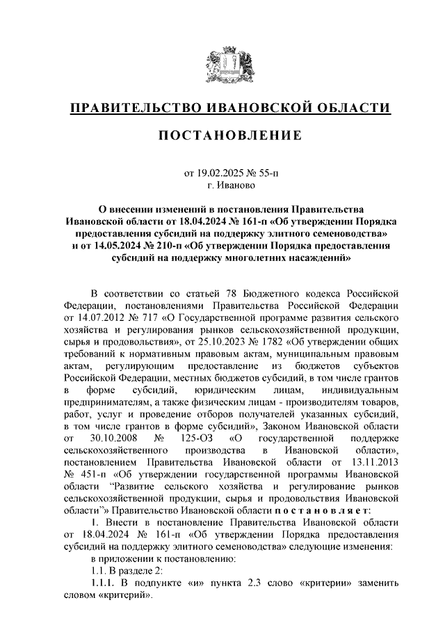 Постановление Правительства Ивановской области от 19.02.2025 N 55-п "О внесении изменений в постановления Правительства Ивановской области от 18.04.2024 N 161-п "Об утверждении Порядка предоставления субсидий на поддержку элитного семеноводства" и от 14.05.2024 N 210-п "Об утверждении Порядка предоставления субсидий на поддержку многолетних насаждений"