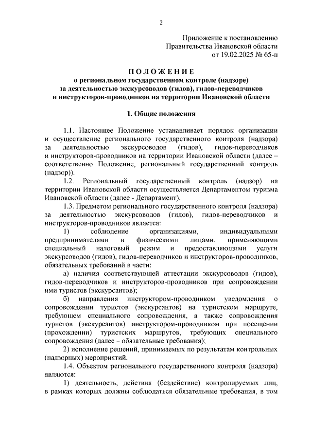 Постановление Правительства Ивановской области от 19.02.2025 N 65-п "Об утверждении Положения о региональном государственном контроле (надзоре) за деятельностью экскурсоводов (гидов), гидов-переводчиков и инструкторов-проводников на территории Ивановской области"