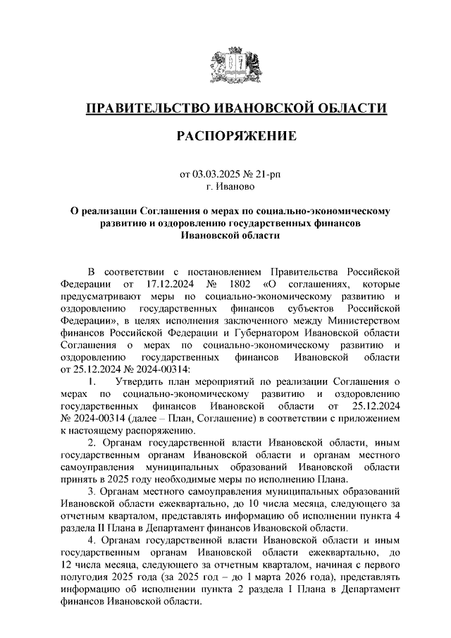 Распоряжение Правительства Ивановской области от 03.03.2025 N 21-рп "О реализации Соглашения о мерах по социально-экономическому развитию и оздоровлению государственных финансов Ивановской области" (вместе с "Планом мероприятий по реализации Соглашения о мерах по социально-экономическому развитию и оздоровлению государственных финансов Ивановской области от 25.12.2024 N 2024-00314")