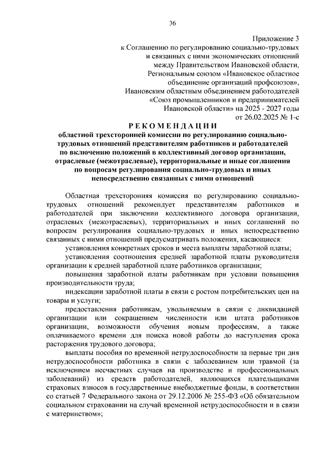 "Соглашение по регулированию социально-трудовых и связанных с ними экономических отношений между Правительством Ивановской области, Региональным союзом "Ивановское областное объединение организаций профсоюзов", Ивановским областным объединением работодателей "Союз промышленников и предпринимателей Ивановской области" на 2025 - 2027 годы" (Заключено 26.02.2025 N 1-с) (вместе с "Перечнем основных показателей прогноза социально-экономического развития Ивановской области и проекта областного бюджета на очередной финансовый год и на плановый период, по которым проводятся консультации Сторон", "Рекомендациями областной трехсторонней комиссии по регулированию социально-трудовых отношений представителям работников и работодателей по включению положений в коллективный договор организации, отраслевые (межотраслевые), территориальные и иные соглашения по вопросам регулирования социально-трудовых и иных непосредственно связанных с ними отношений")