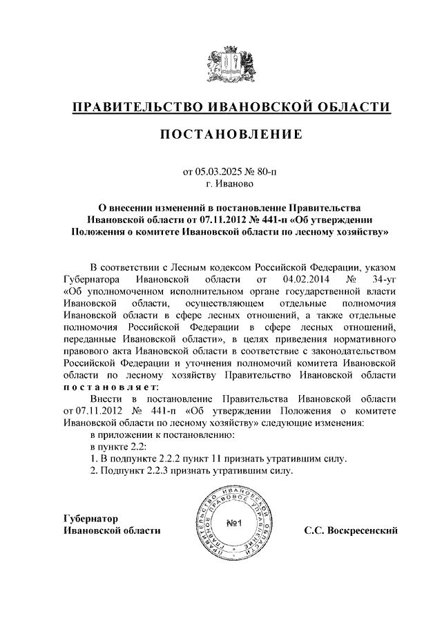 Постановление Правительства Ивановской области от 05.03.2025 N 80-п "О внесении изменений в постановление Правительства Ивановской области от 07.11.2012 N 441-п "Об утверждении Положения о комитете Ивановской области по лесному хозяйству"