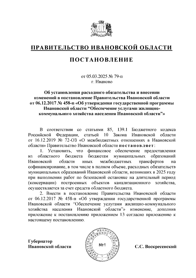 Постановление Правительства Ивановской области от 05.03.2025 N 79-п "Об установлении расходного обязательства и внесении изменений в постановление Правительства Ивановской области от 06.12.2017 N 458-п "Об утверждении государственной программы Ивановской области "Обеспечение услугами жилищно-коммунального хозяйства населения Ивановской области" (вместе с "Методикой распределения и правилами предоставления из областного бюджета бюджетам муниципальных образований Ивановской области иных межбюджетных трансфертов на софинансирование, в том числе в полном объеме, расходных обязательств муниципальных образований Ивановской области, возникших в 2025 году при выполнении работ по безопасной остановке на длительный период (консервации) построенных объектов канализационного хозяйства")