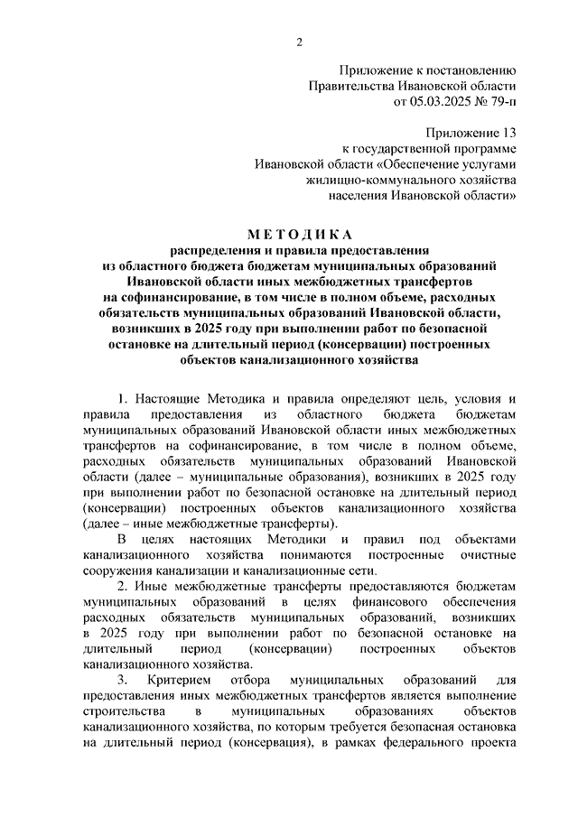 Постановление Правительства Ивановской области от 05.03.2025 N 79-п "Об установлении расходного обязательства и внесении изменений в постановление Правительства Ивановской области от 06.12.2017 N 458-п "Об утверждении государственной программы Ивановской области "Обеспечение услугами жилищно-коммунального хозяйства населения Ивановской области" (вместе с "Методикой распределения и правилами предоставления из областного бюджета бюджетам муниципальных образований Ивановской области иных межбюджетных трансфертов на софинансирование, в том числе в полном объеме, расходных обязательств муниципальных образований Ивановской области, возникших в 2025 году при выполнении работ по безопасной остановке на длительный период (консервации) построенных объектов канализационного хозяйства")