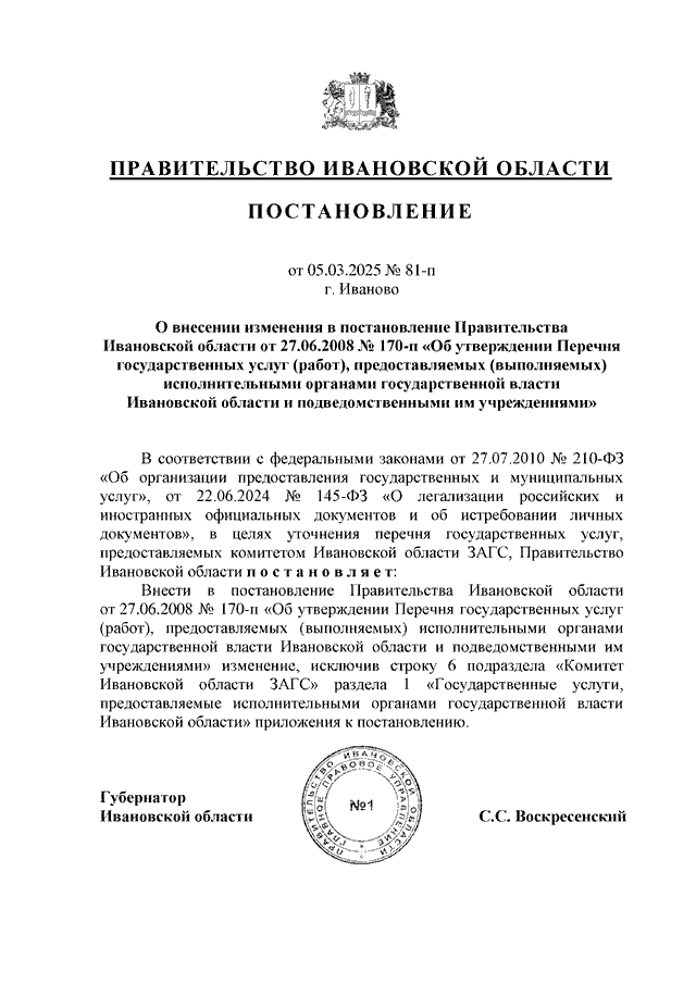 Постановление Правительства Ивановской области от 05.03.2025 N 81-п "О внесении изменения в постановление Правительства Ивановской области от 27.06.2008 N 170-п "Об утверждении Перечня государственных услуг (работ), предоставляемых (выполняемых) исполнительными органами государственной власти Ивановской области и подведомственными им учреждениями"