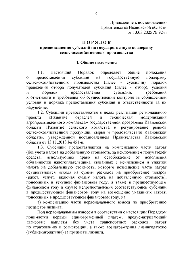 Постановление Правительства Ивановской области от 13.03.2025 N 92-п "Об утверждении Порядка предоставления субсидий на государственную поддержку сельскохозяйственного производства"