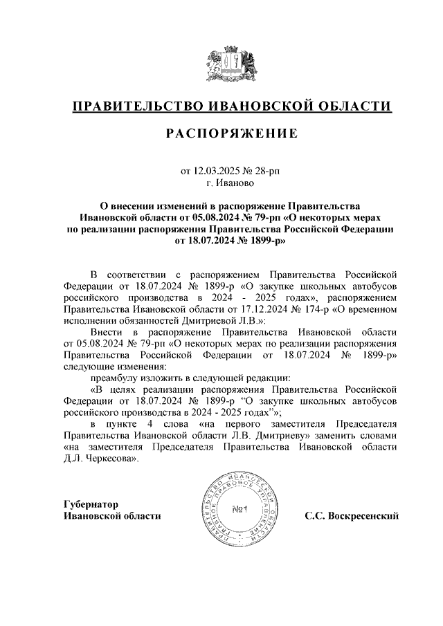 Распоряжение Правительства Ивановской области от 12.03.2025 N 28-рп "О внесении изменений в распоряжение Правительства Ивановской области от 05.08.2024 N 79-рп "О некоторых мерах по реализации распоряжения Правительства Российской Федерации от 18.07.2024 N 1899-р"