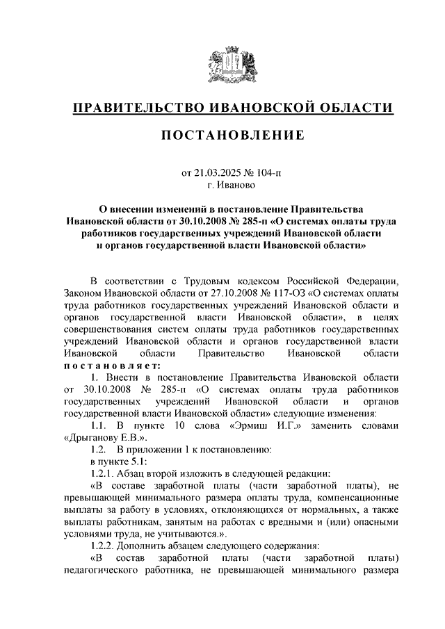 Постановление Правительства Ивановской области от 21.03.2025 N 104-п "О внесении изменений в постановление Правительства Ивановской области от 30.10.2008 N 285-п "О системах оплаты труда работников государственных учреждений Ивановской области и органов государственной власти Ивановской области"