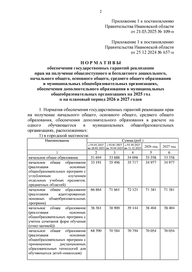 Постановление Правительства Ивановской области от 21.03.2025 N 109-п "О внесении изменений в постановление Правительства Ивановской области от 25.12.2024 N 657-п "Об утверждении нормативов обеспечения государственных гарантий реализации прав на получение общедоступного и бесплатного общего образования, обеспечения дополнительного образования в муниципальных образовательных организациях и возмещения затрат на финансовое обеспечение получения общего образования в частных образовательных организациях на 2025 год и на плановый период 2026 и 2027 годов" (вместе с "Нормативами обеспечения государственных гарантий реализации прав на получение общедоступного и бесплатного дошкольного, начального общего, основного общего, среднего общего образования в муниципальных общеобразовательных организациях, обеспечения дополнительного образования в муниципальных общеобразовательных организациях на 2025 год и на плановый период 2026 и 2027 годов", "Нормативами возмещения затрат на финансовое обеспечение получения дошкольного, начального общего, основного общего, среднего общего образования в частных общеобразовательных организациях, осуществляющих образовательную деятельность по имеющим государственную аккредитацию основным общеобразовательным программам, на 2025 год и на плановый период 2026 и 2027 годов")