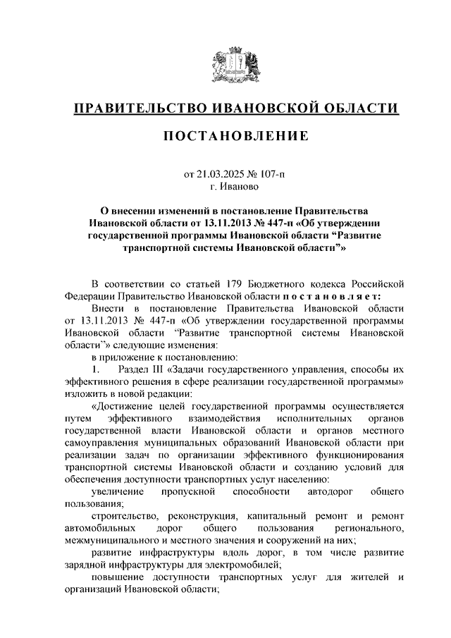 Постановление Правительства Ивановской области от 21.03.2025 N 107-п "О внесении изменений в постановление Правительства Ивановской области от 13.11.2013 N 447-п "Об утверждении государственной программы Ивановской области "Развитие транспортной системы Ивановской области"