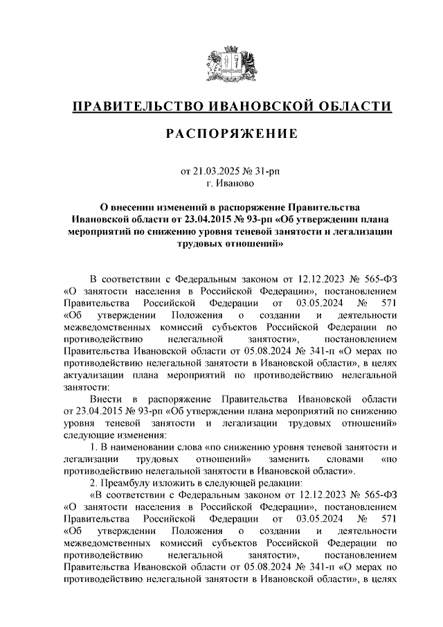 Распоряжение Правительства Ивановской области от 21.03.2025 N 31-рп "О внесении изменений в распоряжение Правительства Ивановской области от 23.04.2015 N 93-рп "Об утверждении плана мероприятий по снижению уровня теневой занятости и легализации трудовых отношений"