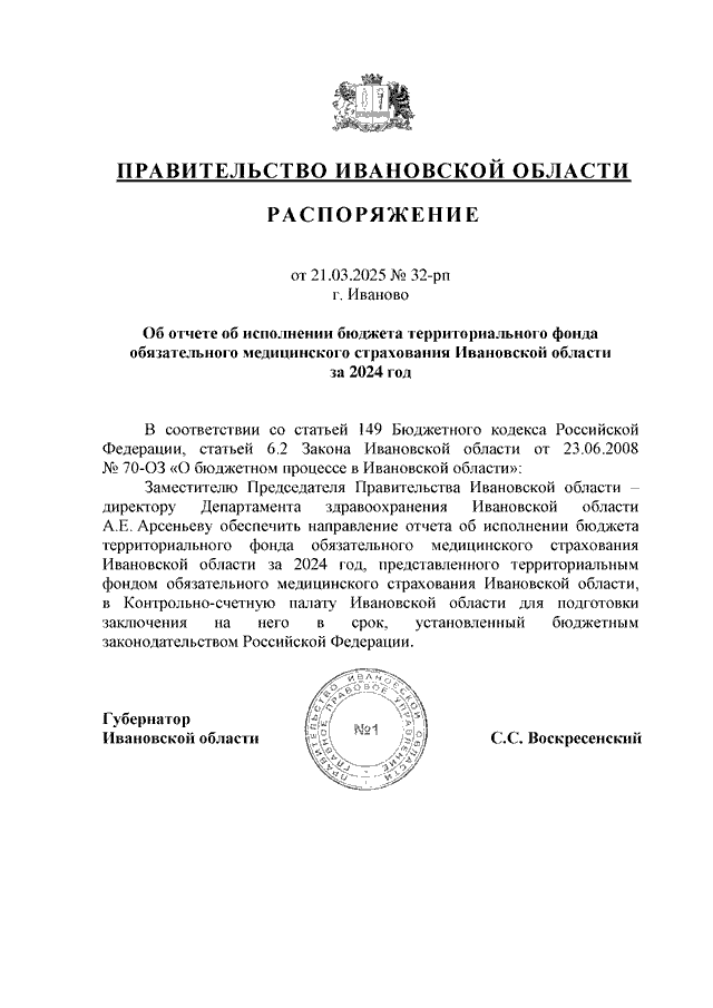 Распоряжение Правительства Ивановской области от 21.03.2025 N 32-рп "Об отчете об исполнении бюджета территориального фонда обязательного медицинского страхования Ивановской области за 2024 год"