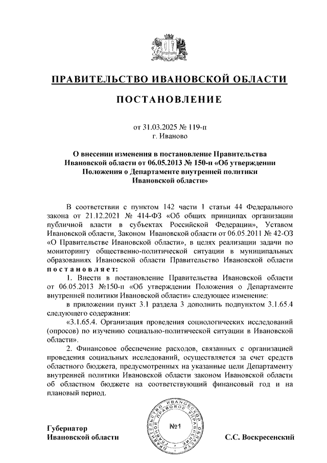 Постановление Правительства Ивановской области от 31.03.2025 N 119-п "О внесении изменения в постановление Правительства Ивановской области от 06.05.2013 N 150-п "Об утверждении Положения о Департаменте внутренней политики Ивановской области"