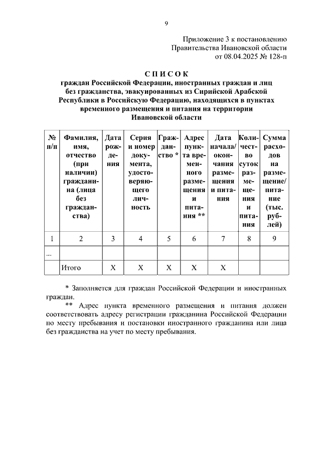 Постановление Правительства Ивановской области от 08.04.2025 N 128-п "Об обеспечении мероприятий по временному размещению и питанию граждан Российской Федерации, иностранных граждан и лиц без гражданства, эвакуированных из Сирийской Арабской Республики в Российскую Федерацию, в пунктах временного размещения и питания на территории Ивановской области"