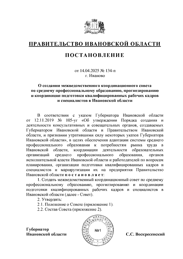 Постановление Правительства Ивановской области от 14.04.2025 N 134-п "О создании межведомственного координационного совета по среднему профессиональному образованию, прогнозированию и координации подготовки квалифицированных рабочих кадров и специалистов в Ивановской области" (вместе с "Положением о межведомственном координационном Совете по среднему профессиональному образованию, прогнозированию и координации подготовки квалифицированных рабочих кадров и специалистов в Ивановской области")
