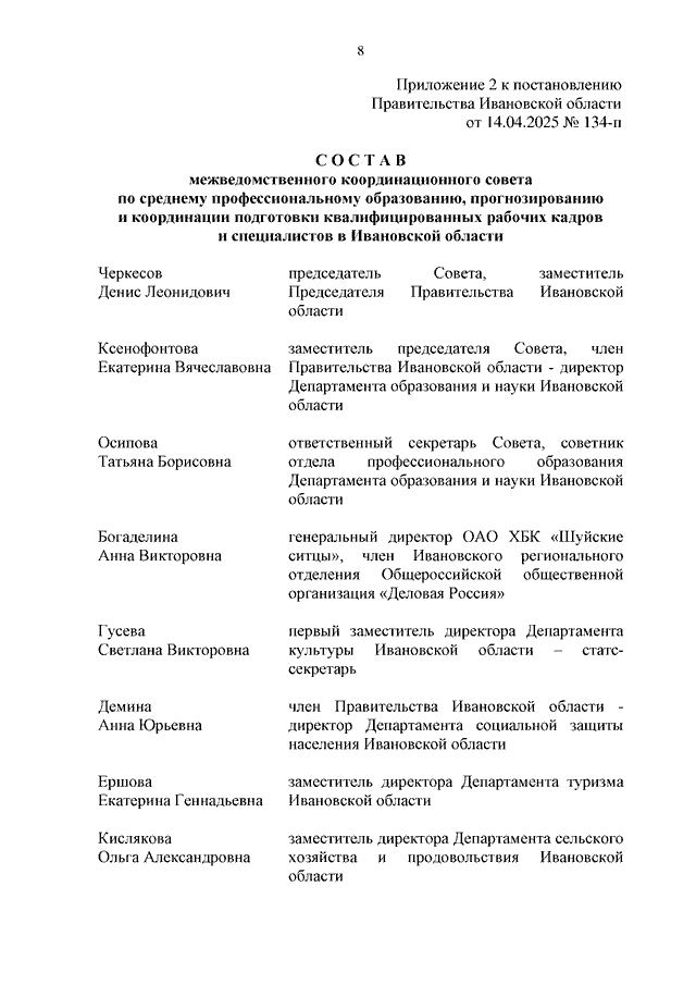 Постановление Правительства Ивановской области от 14.04.2025 N 134-п "О создании межведомственного координационного совета по среднему профессиональному образованию, прогнозированию и координации подготовки квалифицированных рабочих кадров и специалистов в Ивановской области" (вместе с "Положением о межведомственном координационном Совете по среднему профессиональному образованию, прогнозированию и координации подготовки квалифицированных рабочих кадров и специалистов в Ивановской области")