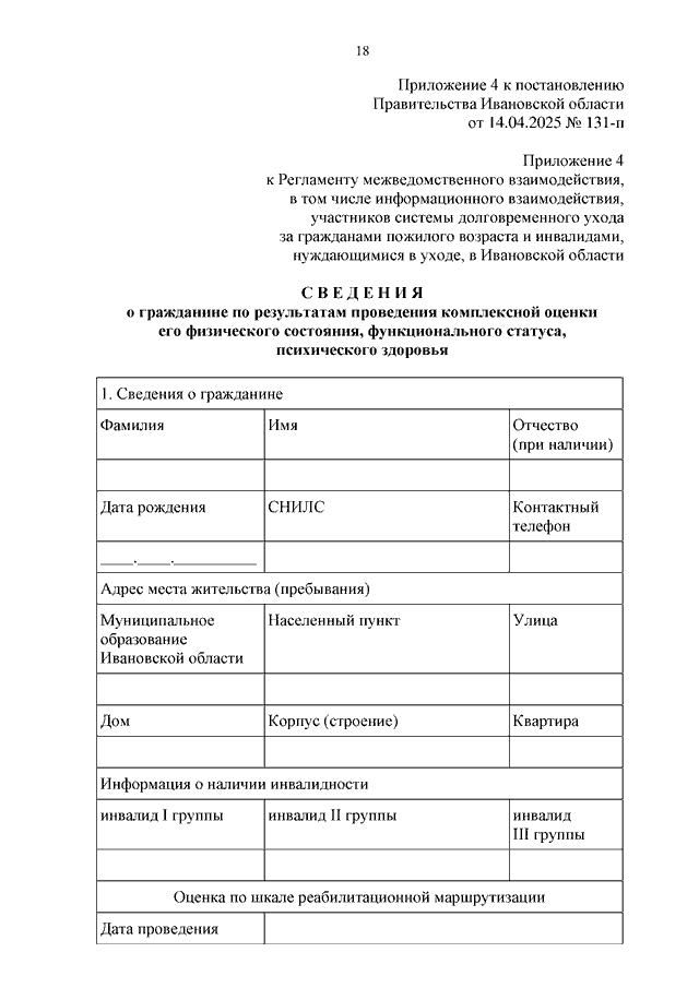 Постановление Правительства Ивановской области от 14.04.2025 N 131-п "О внесении изменений в постановление Правительства Ивановской области от 08.07.2024 N 293-п "Об утверждении Регламента межведомственного взаимодействия, в том числе информационного взаимодействия, участников системы долговременного ухода за гражданами пожилого возраста и инвалидами, нуждающимися в уходе, в Ивановской области и создании межведомственной комиссии по внедрению системы долговременного ухода за гражданами пожилого возраста и инвалидами, нуждающимися в уходе, в Ивановской области" (вместе с "Перечнем организаций социального обслуживания, находящихся в ведении Ивановской области, участвующих в системе долговременного ухода за гражданами пожилого возраста и инвалидами, нуждающимися в уходе", "Перечнем медицинских организаций, участвующих в системе долговременного ухода за гражданами пожилого возраста и инвалидами, нуждающимися в уходе")