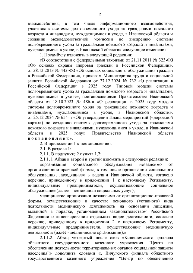Постановление Правительства Ивановской области от 14.04.2025 N 131-п "О внесении изменений в постановление Правительства Ивановской области от 08.07.2024 N 293-п "Об утверждении Регламента межведомственного взаимодействия, в том числе информационного взаимодействия, участников системы долговременного ухода за гражданами пожилого возраста и инвалидами, нуждающимися в уходе, в Ивановской области и создании межведомственной комиссии по внедрению системы долговременного ухода за гражданами пожилого возраста и инвалидами, нуждающимися в уходе, в Ивановской области" (вместе с "Перечнем организаций социального обслуживания, находящихся в ведении Ивановской области, участвующих в системе долговременного ухода за гражданами пожилого возраста и инвалидами, нуждающимися в уходе", "Перечнем медицинских организаций, участвующих в системе долговременного ухода за гражданами пожилого возраста и инвалидами, нуждающимися в уходе")