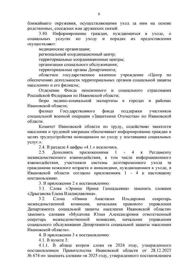Постановление Правительства Ивановской области от 14.04.2025 N 131-п "О внесении изменений в постановление Правительства Ивановской области от 08.07.2024 N 293-п "Об утверждении Регламента межведомственного взаимодействия, в том числе информационного взаимодействия, участников системы долговременного ухода за гражданами пожилого возраста и инвалидами, нуждающимися в уходе, в Ивановской области и создании межведомственной комиссии по внедрению системы долговременного ухода за гражданами пожилого возраста и инвалидами, нуждающимися в уходе, в Ивановской области" (вместе с "Перечнем организаций социального обслуживания, находящихся в ведении Ивановской области, участвующих в системе долговременного ухода за гражданами пожилого возраста и инвалидами, нуждающимися в уходе", "Перечнем медицинских организаций, участвующих в системе долговременного ухода за гражданами пожилого возраста и инвалидами, нуждающимися в уходе")