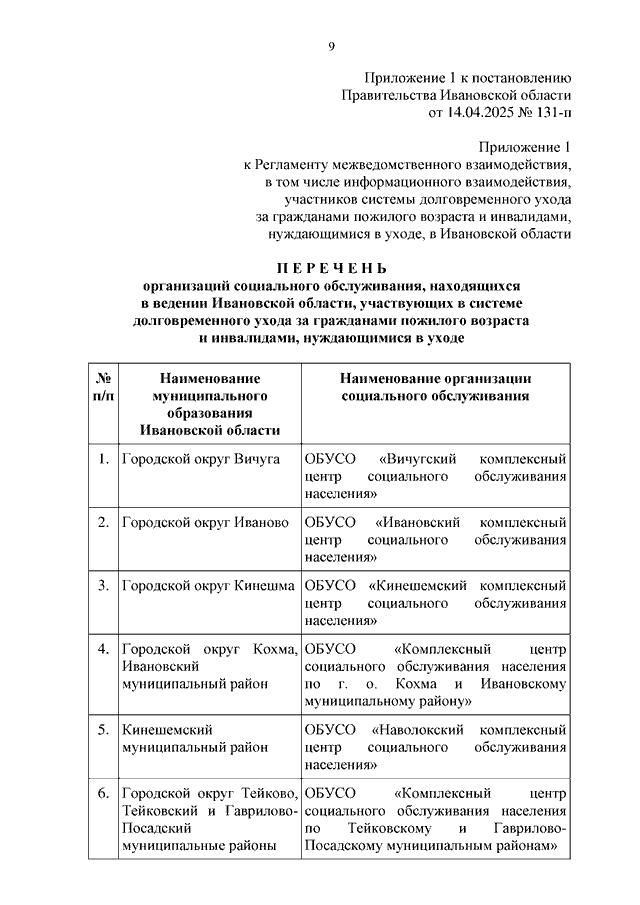 Постановление Правительства Ивановской области от 14.04.2025 N 131-п "О внесении изменений в постановление Правительства Ивановской области от 08.07.2024 N 293-п "Об утверждении Регламента межведомственного взаимодействия, в том числе информационного взаимодействия, участников системы долговременного ухода за гражданами пожилого возраста и инвалидами, нуждающимися в уходе, в Ивановской области и создании межведомственной комиссии по внедрению системы долговременного ухода за гражданами пожилого возраста и инвалидами, нуждающимися в уходе, в Ивановской области" (вместе с "Перечнем организаций социального обслуживания, находящихся в ведении Ивановской области, участвующих в системе долговременного ухода за гражданами пожилого возраста и инвалидами, нуждающимися в уходе", "Перечнем медицинских организаций, участвующих в системе долговременного ухода за гражданами пожилого возраста и инвалидами, нуждающимися в уходе")