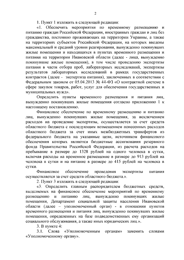 Постановление Правительства Ивановской области от 14.04.2025 N 133-п "О внесении изменений в постановление Правительства Ивановской области от 12.05.2022 N 235-п "Об обеспечении мероприятий по временному размещению и питанию граждан Российской Федерации, иностранных граждан и лиц без гражданства, постоянно проживающих на территории Украины, а также на территориях субъектов Российской Федерации, на которых введены максимальный и средний уровни реагирования, вынужденно покинувших жилые помещения и находящихся в пунктах временного размещения и питания на территории Ивановской области"