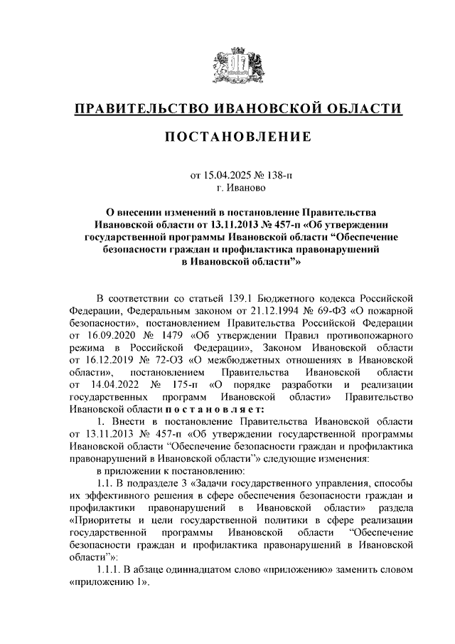 Постановление Правительства Ивановской области от 15.04.2025 N 138-п "О внесении изменений в постановление Правительства Ивановской области от 13.11.2013 N 457-п "Об утверждении государственной программы Ивановской области "Обеспечение безопасности граждан и профилактика правонарушений в Ивановской области" (вместе с "Методикой распределения и правилами предоставления в 2025 году иных межбюджетных трансфертов бюджетам муниципальных образований Ивановской области на обеспечение автономными дымовыми пожарными извещателями мест проживания отдельных категорий граждан на территории Ивановской области")
