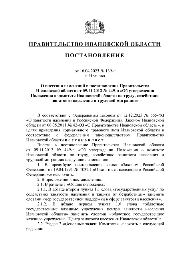 Постановление Правительства Ивановской области от 16.04.2025 N 139-п "О внесении изменений в постановление Правительства Ивановской области от 09.11.2012 N 449-п "Об утверждении Положения о комитете Ивановской области по труду, содействию занятости населения и трудовой миграции"