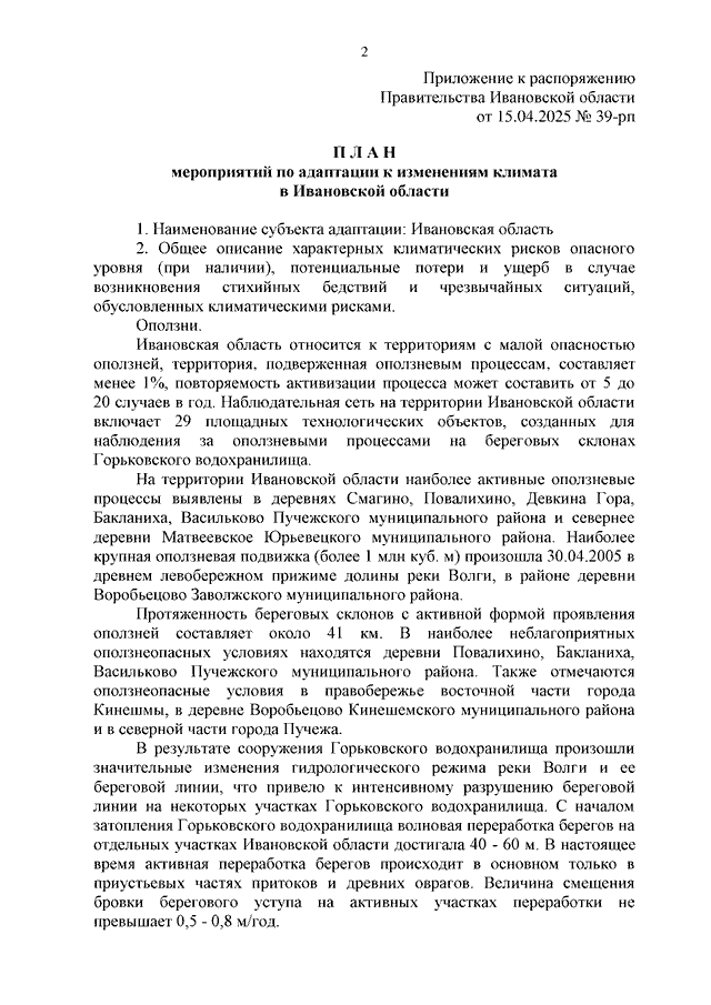 Распоряжение Правительства Ивановской области от 15.04.2025 N 39-рп "О внесении изменений в распоряжение Правительства Ивановской области от 05.08.2022 N 92-рп "Об утверждении плана мероприятий по адаптации к изменениям климата в Ивановской области"