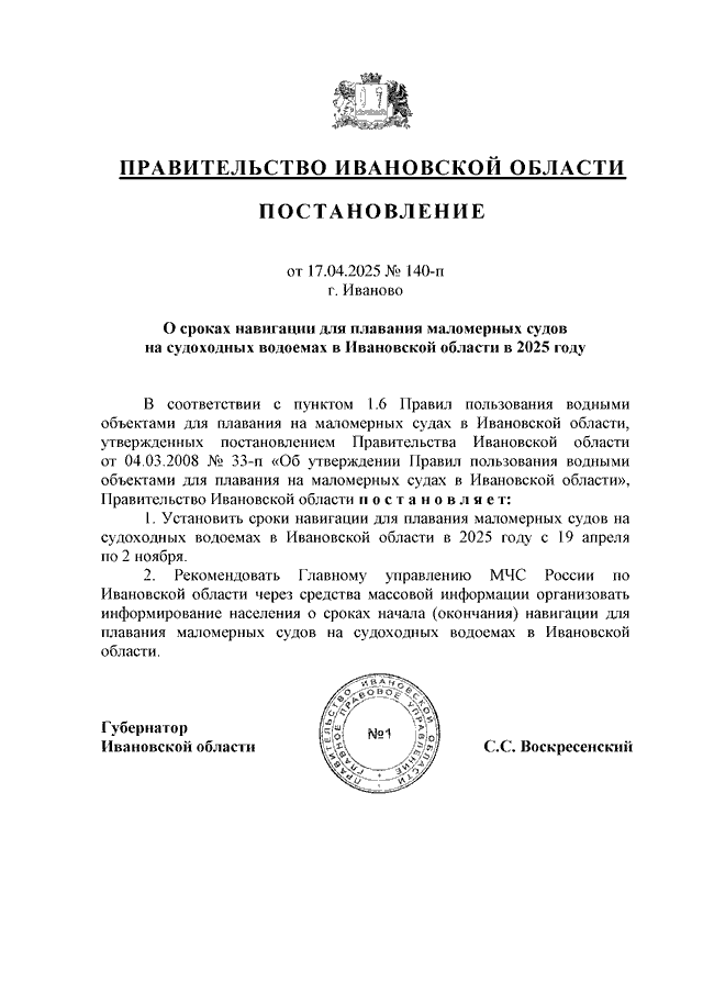 Постановление Правительства Ивановской области от 17.04.2025 N 140-п "О сроках навигации для плавания маломерных судов на судоходных водоемах в Ивановской области в 2025 году"