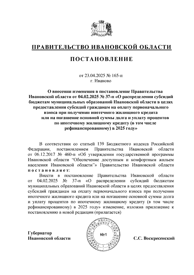 Постановление Правительства Ивановской области от 23.04.2025 N 165-п "О внесении изменения в постановление Правительства Ивановской области от 04.02.2025 N 37-п "О распределении субсидий бюджетам муниципальных образований Ивановской области в целях предоставления субсидий гражданам на оплату первоначального взноса при получении ипотечного жилищного кредита или на погашение основной суммы долга и уплату процентов по ипотечному жилищному кредиту (в том числе рефинансированному) в 2025 году"
