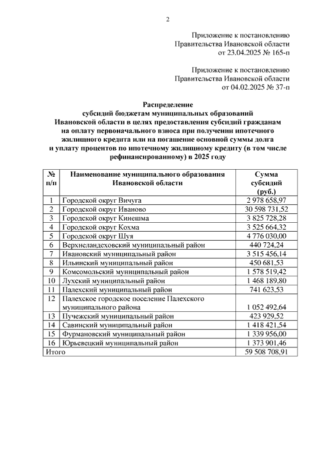 Постановление Правительства Ивановской области от 23.04.2025 N 165-п "О внесении изменения в постановление Правительства Ивановской области от 04.02.2025 N 37-п "О распределении субсидий бюджетам муниципальных образований Ивановской области в целях предоставления субсидий гражданам на оплату первоначального взноса при получении ипотечного жилищного кредита или на погашение основной суммы долга и уплату процентов по ипотечному жилищному кредиту (в том числе рефинансированному) в 2025 году"