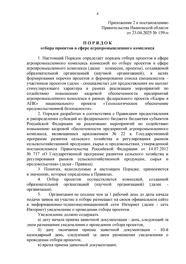 Постановление Правительства Ивановской области от 23.04.2025 N 159-п "Об утверждении Порядка создания комиссии по отбору проектов в сфере агропромышленного комплекса и Порядка отбора проектов в сфере агропромышленного комплекса"